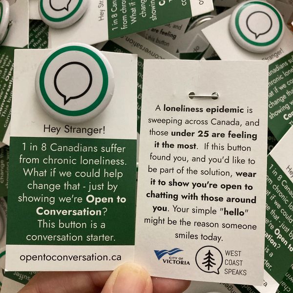 This project relies heavily on volunteer and community support to share the buttons around Victoria. We will be hosting at least two 'button parties' over the summer to attach thousands of buttons onto information cards. Stay tuned for more information on Open to Conversation in the coming months to find out how you can volunteer to help be a part of this social movement to help inprove our collective social health.